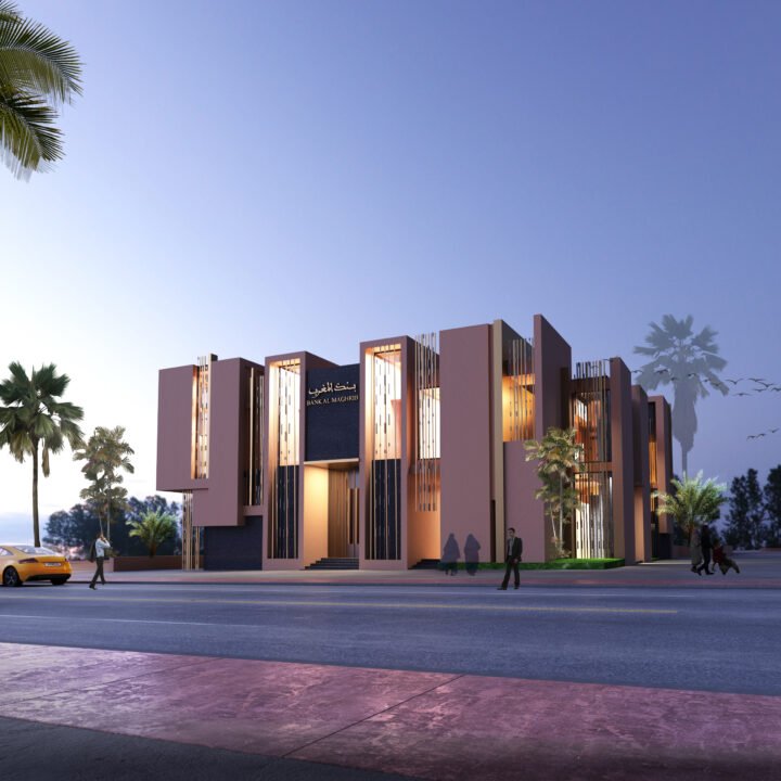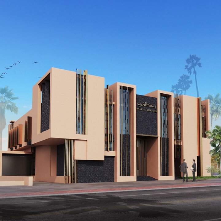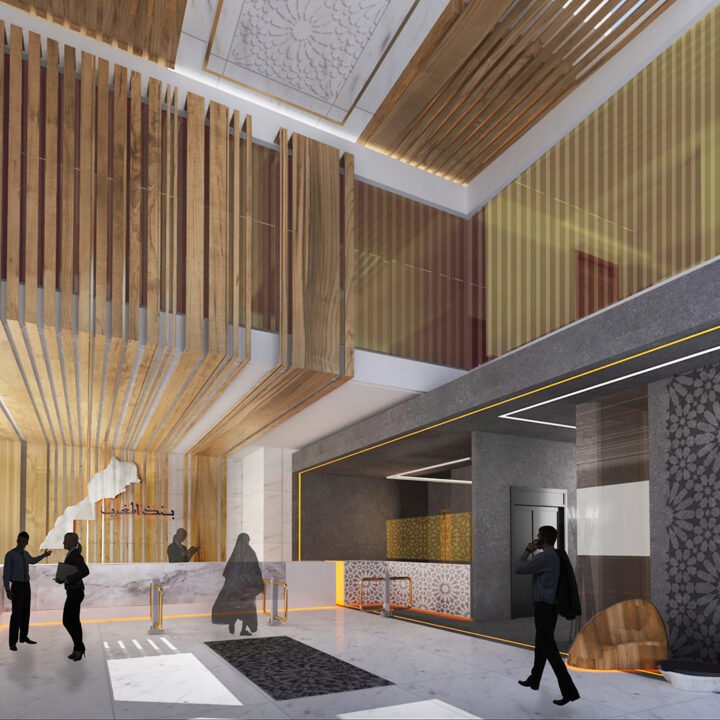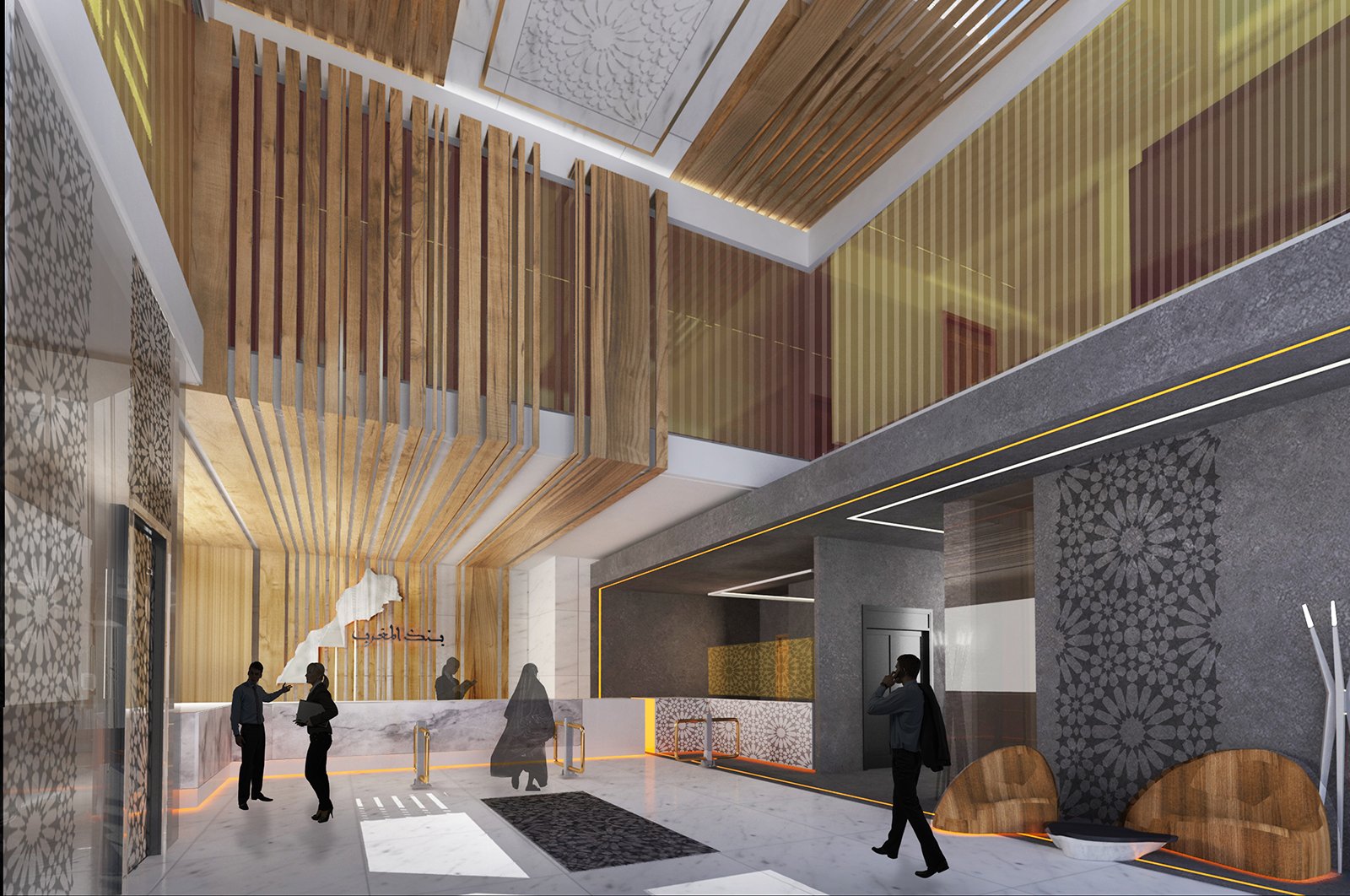 L’architecture des volumes intérieurs se caractérise par la sobriété, la décoration de ces espaces reprends des rapports inspirés des motifs marocains sur des matéraux contemporains , l’utilisation du bois