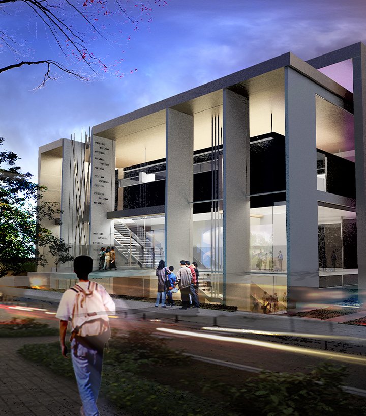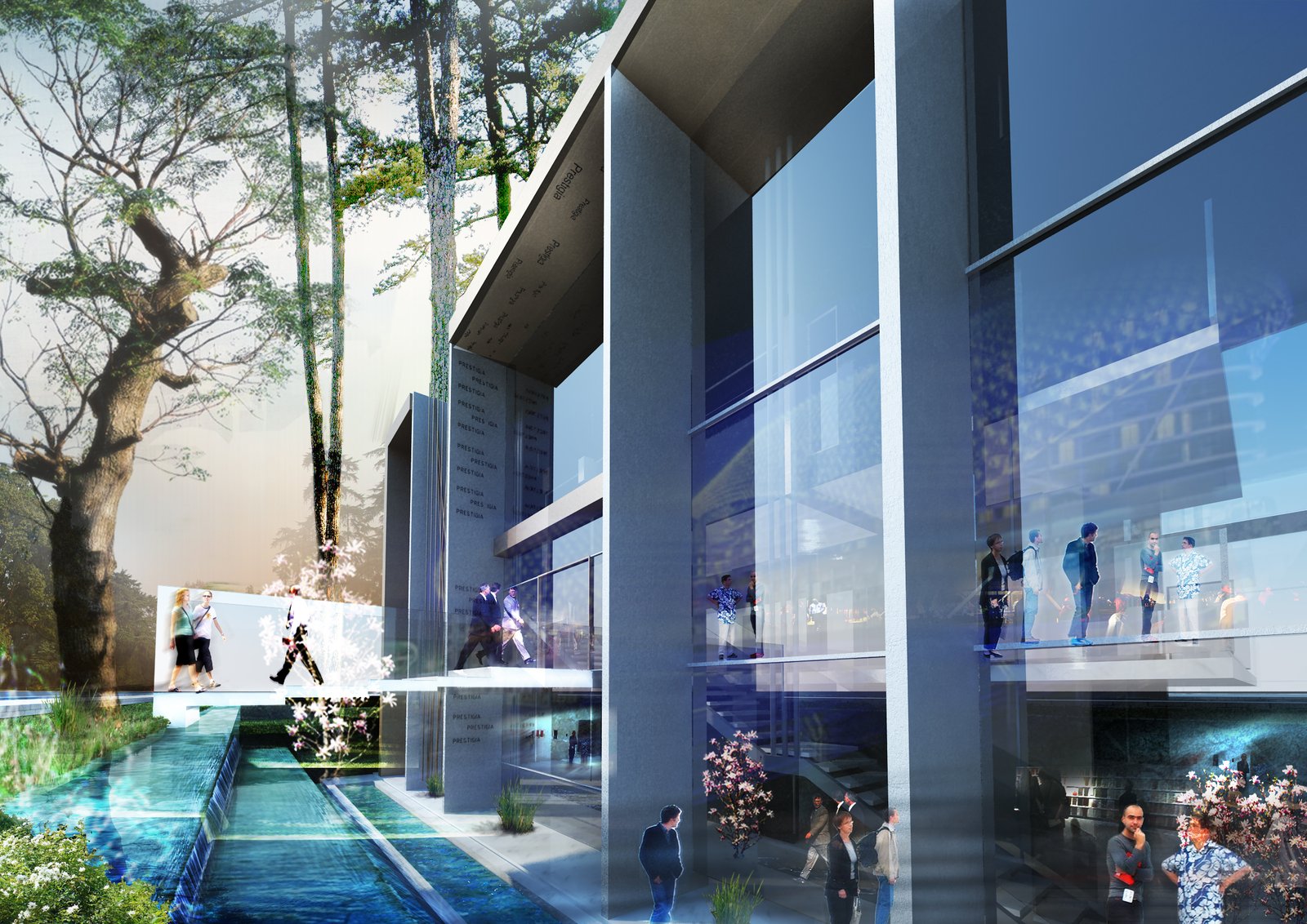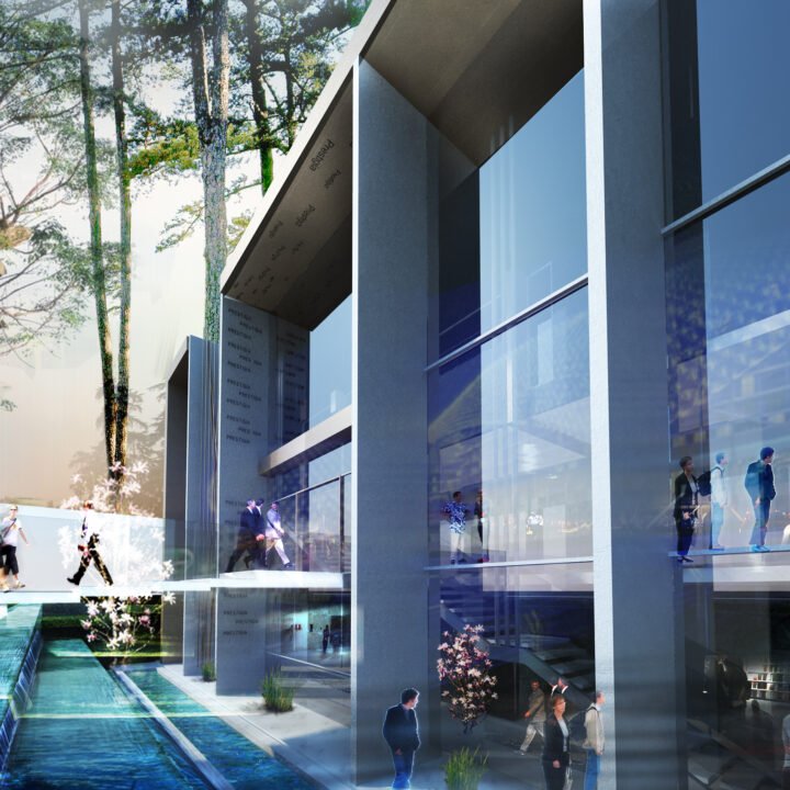 L’entrée principale se fait par le biais d’une passerelle qui surplombe un bassin d’eau entourant l’édifice.