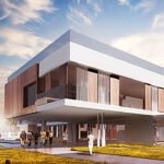 La façade principale est rythmée par un escalier linéaire et ajouré, permettant la desserte des bureaux du hall d’acceuil Un portique géant vient ceinturer le bâtiment et lui confère un aspect monumental.