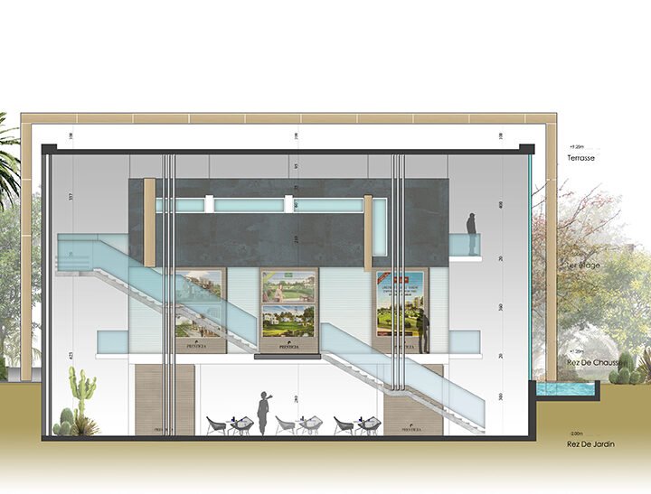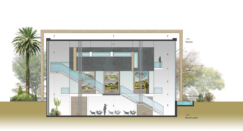 Cet espace de travail est d’exposition est situé dans le quartier Anfa de Casablanca, sur une artère principale. Le bâtiment est simple et sobre. Il est constitué par une grande «boite» en verre, soutenue par de larges pans massifs en béton.