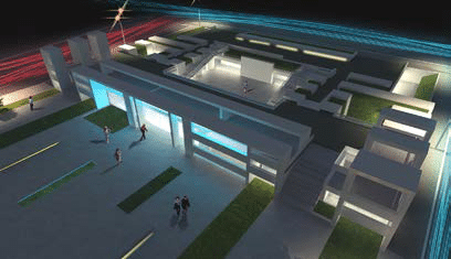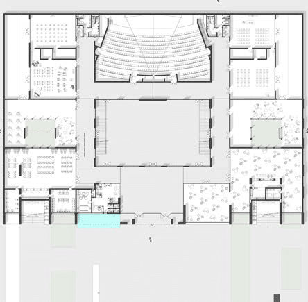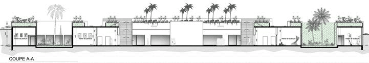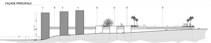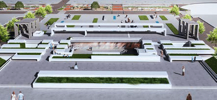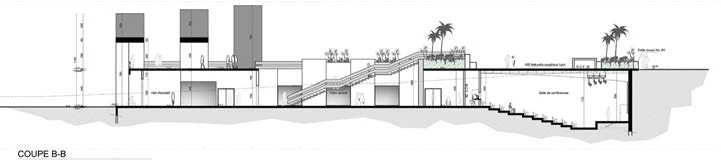 Le complexe a été conçu en respectant la topographie du terrain avec un souci de garder la connexion entre les deux rives du complexe, ainsi le toit de l’équipement est aménagé en une place minérale sous forme de plates forme de différents niveaux, le complexe a été enterré en prévoyant un grand patio central autour duquel s’articulent les composantes du projet afin d’aménager son toit.