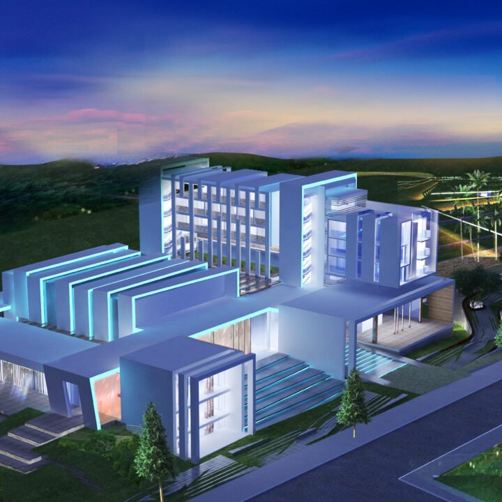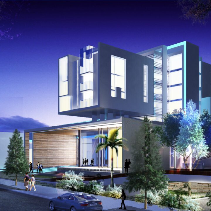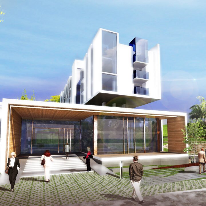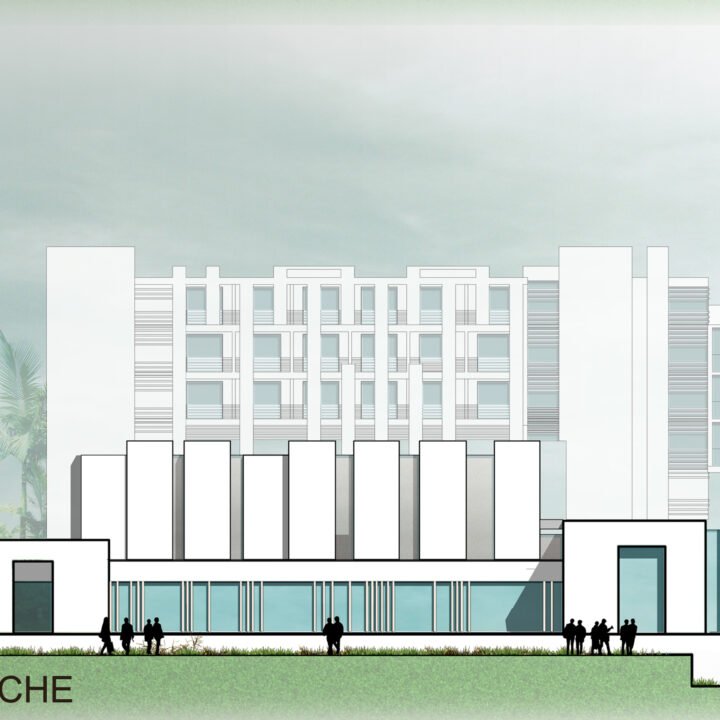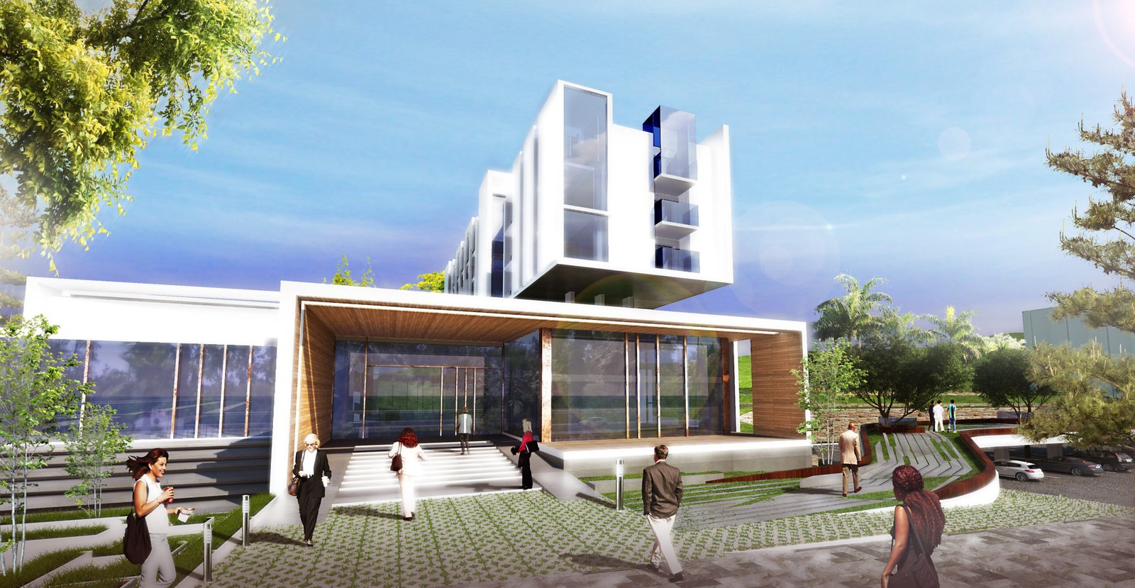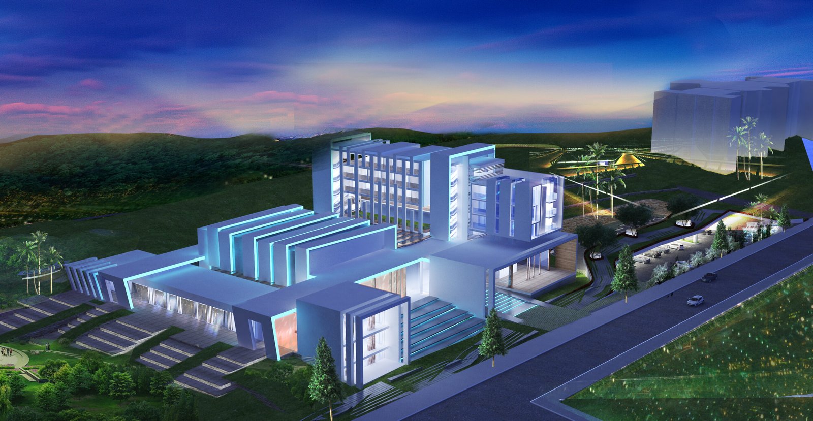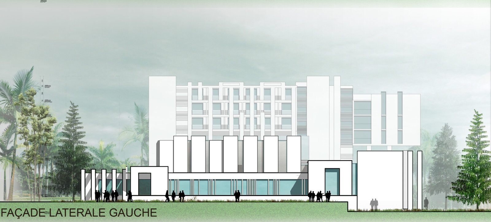 Implanté dans un site fortement végétalisé, le projet s’insère en suivant le relief. Il se compose d’un corps de bâtiments compacts qui se développent en 2 pôles: conférence et hébergement. Une rue intérieure liaisonne les 2 entités et constitue un noyau central d’échanges et de rassemblements