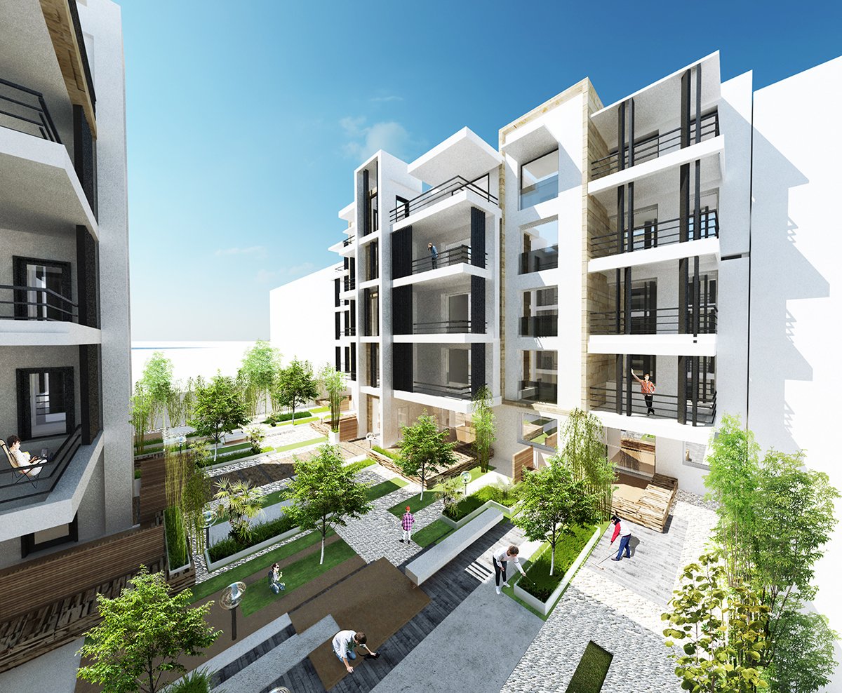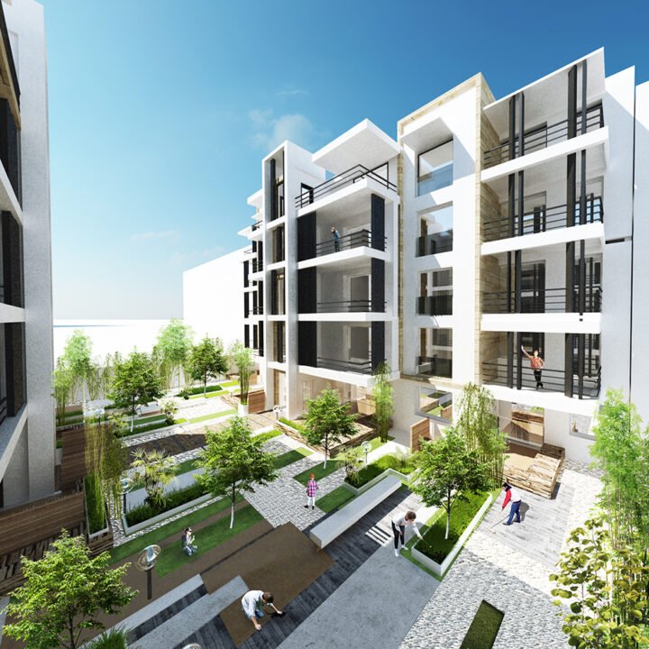 La masse bâtie a été agencée de manière à libérer un espace dégagé sous forme de cour aménagée au premier étage; un intérêt particulier a été accordé au traitement paysager de cette cour; on y distingue des espaces verts, des placettes et des espaces de jeux sécurisés pour les enfants, les appartements du premier niveau résidentiel profitent de jardins privatifs. L’architecture est à la fois sobre et épurée, le choix pour des éléments verticaux en aluminium unifient et simplifient la lecture de la volumétrie générale de l’immeuble, des lignes horizontales et verticales se distinguent, animées par les éléments verticaux en aluminium. Des surfaces en pierre contrastent avec la couleur blanche dominante de la résidence.