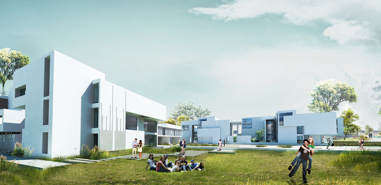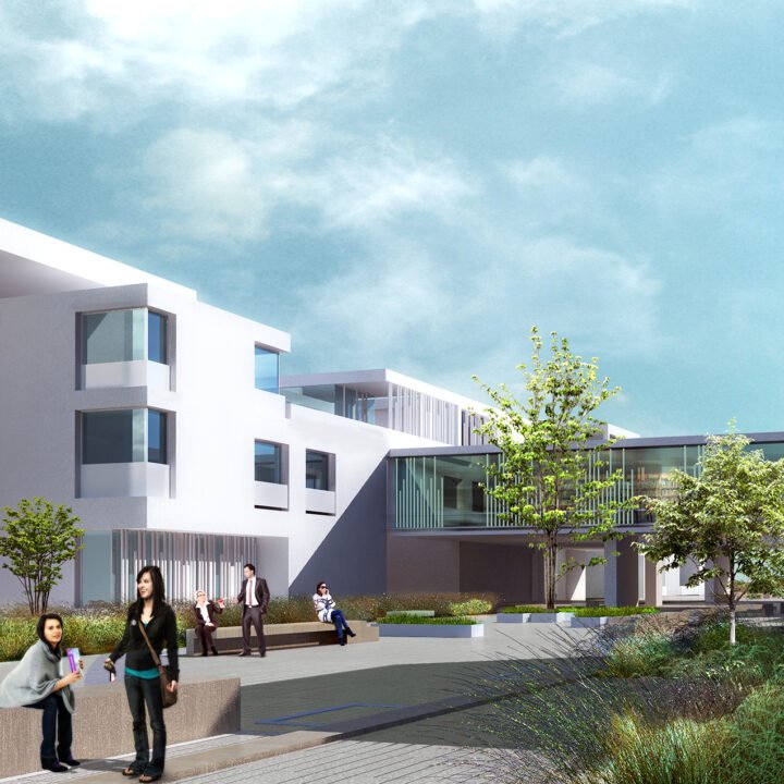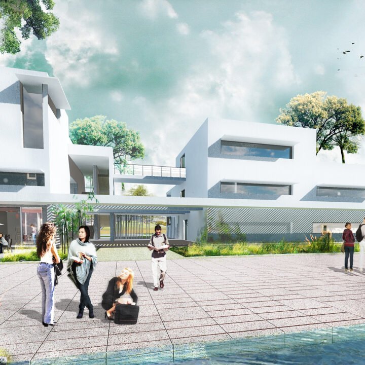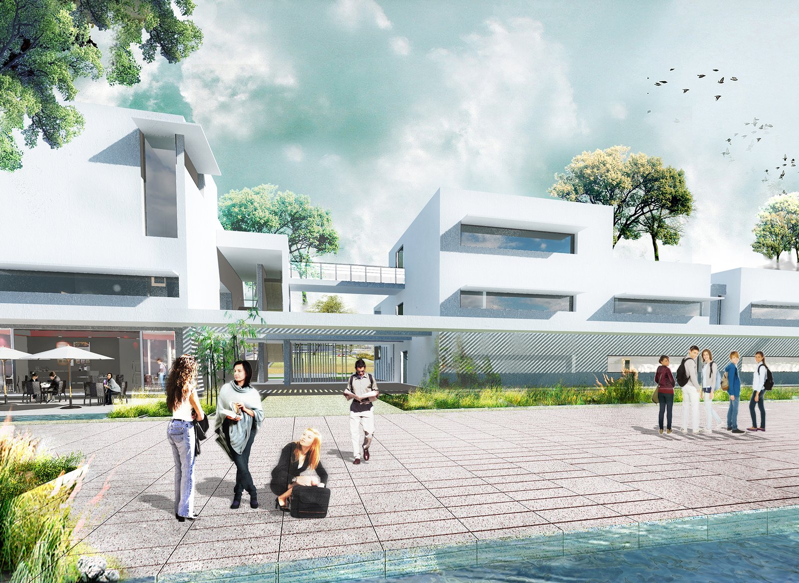 Les deux blocs d’enseignement s’articulent autour d’une rue intérieure qui traverse l’ensemble du projet. Elle constitue un espace d’échange et de rassemblement pour les usagers de l’université et les habitants du quartier. Des ramifications complètent cette rue intérieure et créent des sous-entités distinctes et autonomes au sein des blocs d’enseignement. Elles sont liées entre elles par des passerelles à l’étage.