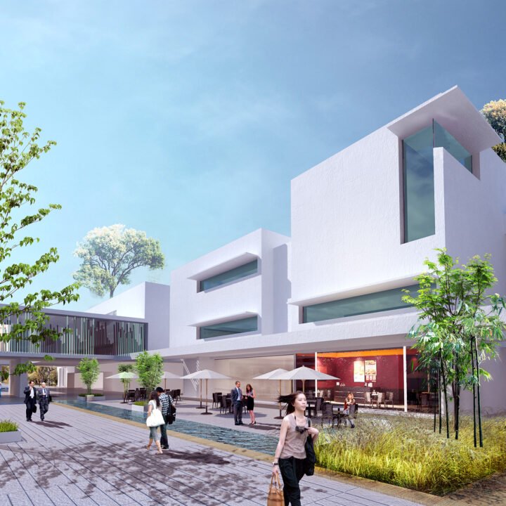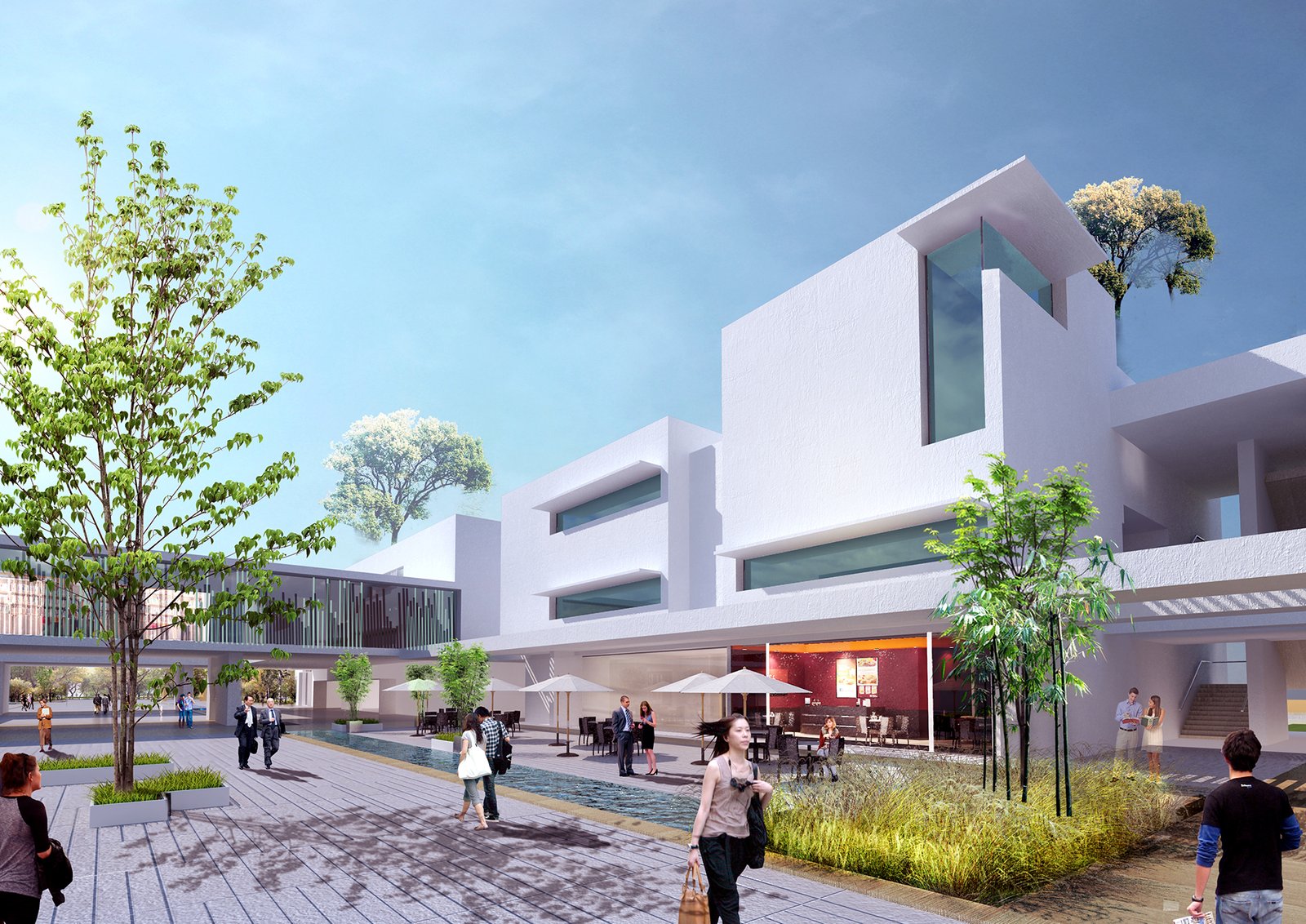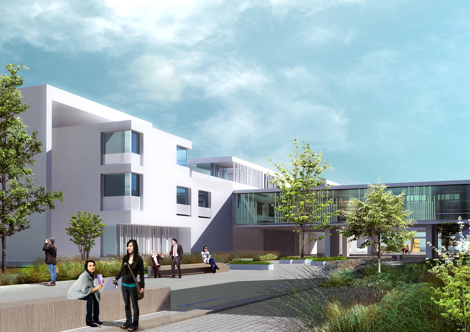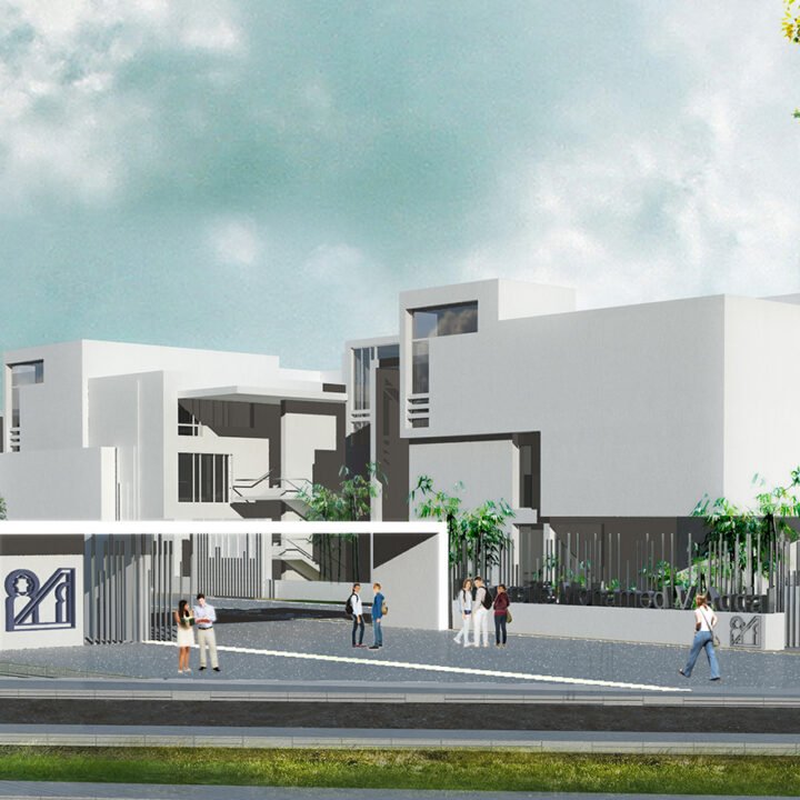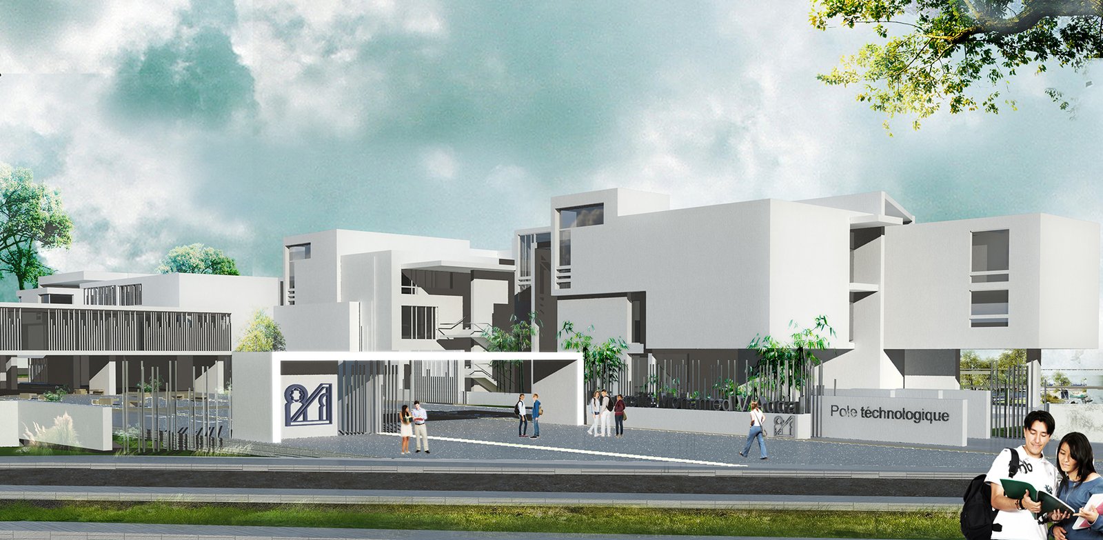 Les deux blocs d’enseignement s’articulent autour d’une rue intérieure qui traverse l’ensemble du projet. Elle constitue un espace d’échange et de rassemblement pour les usagers de l’université et les habitants du quartier. Des ramifications complètent cette rue intérieure et créent des sous-entités distinctes et autonomes au sein des blocs d’enseignement. Elles sont liées entre elles par des passerelles à l’étage.