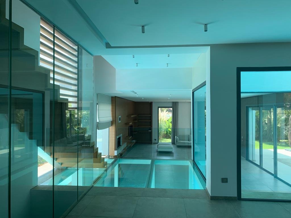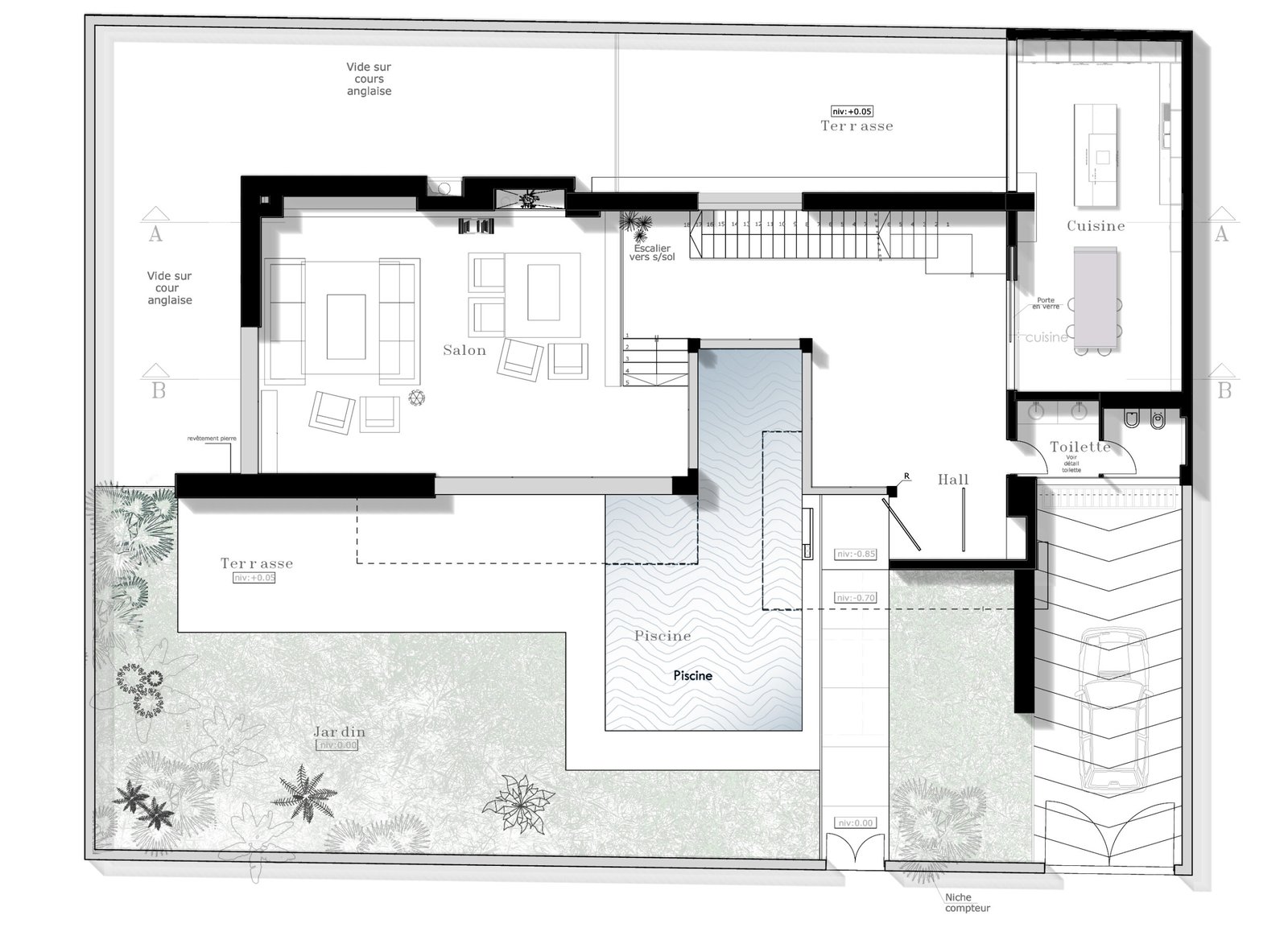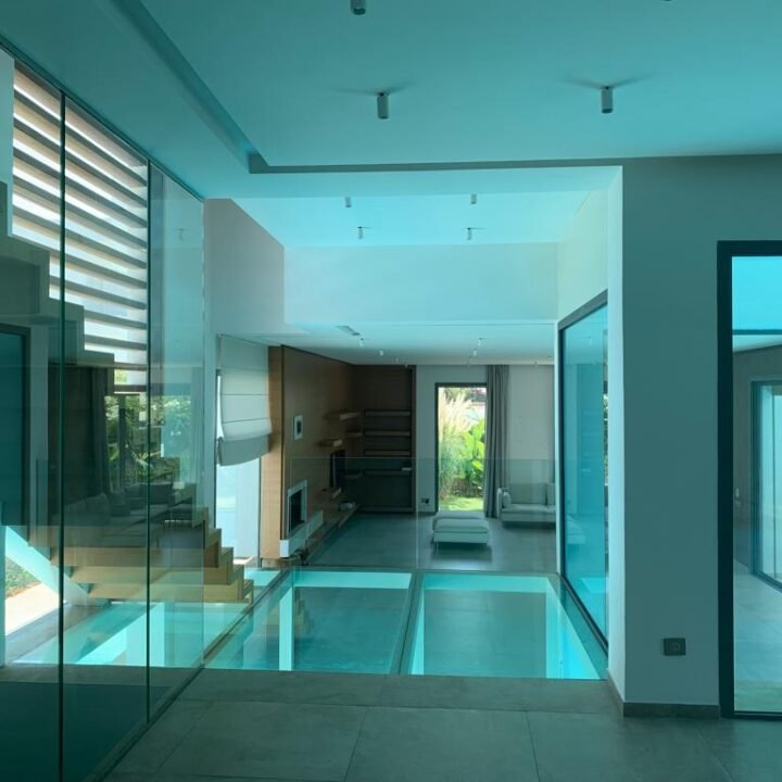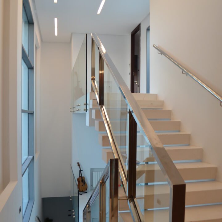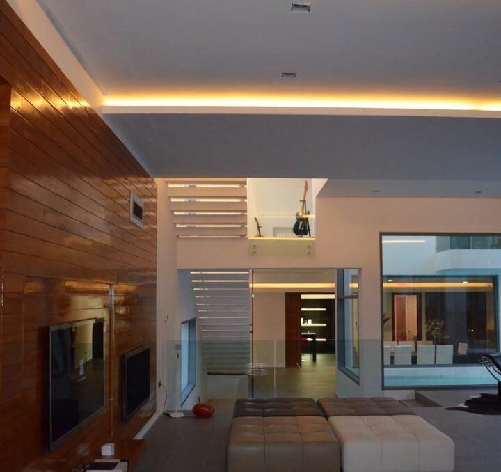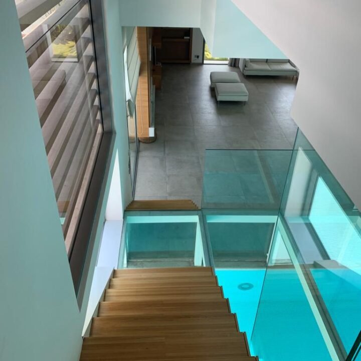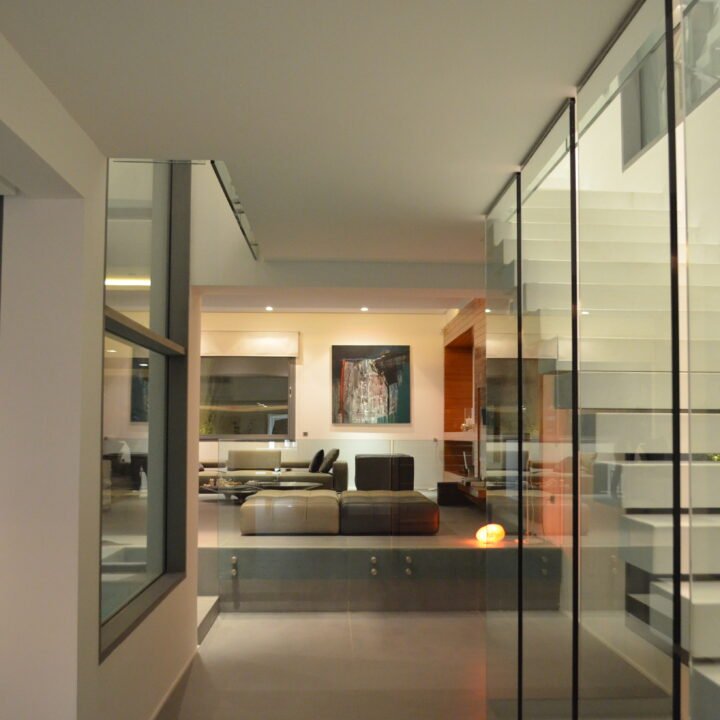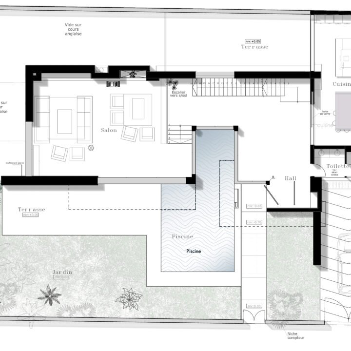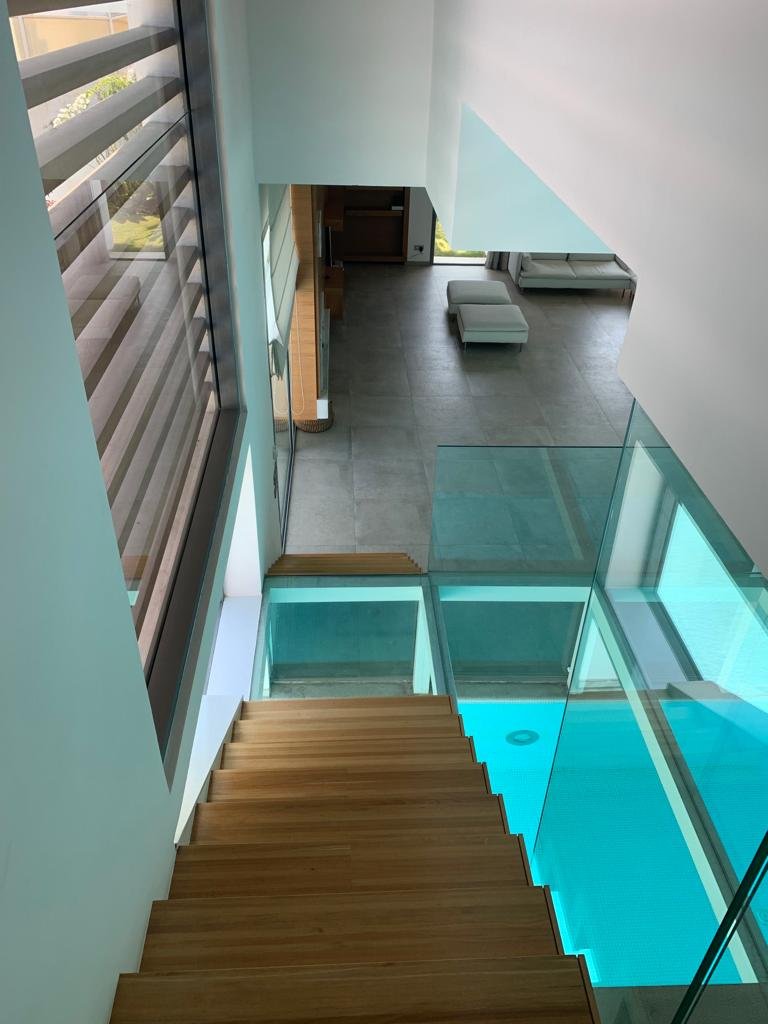 En effet, chaque chambre est représentée par une «boite», qui, superposées l’une sur l’autre, créent un jeu de niveaux entre les étages. Dans l’espace intérieur, cet emboîtement de volumes est liaisonné par des passerelles qui valsent au milieu d’un atrium de 9 m de haut. L’escalier qui conduit à ces passerelles est ajouré, et prend appuit sur la paroi nord de la villa. Il dessert Les 4 différents niveaux de l’habitation. Au niveau du rdc, tous les espaces sont articulés autour de la piscine afin que l’eau soit visuellement omniprésente. Quant au sous-sol, il est traité comme une pièce à vivre et est orienté vers un jardin vertical.