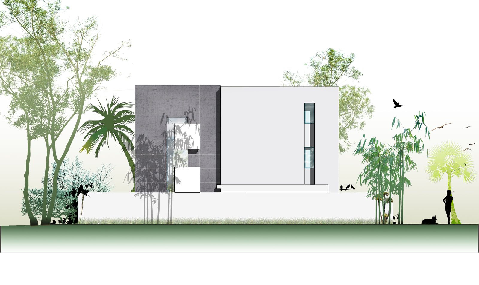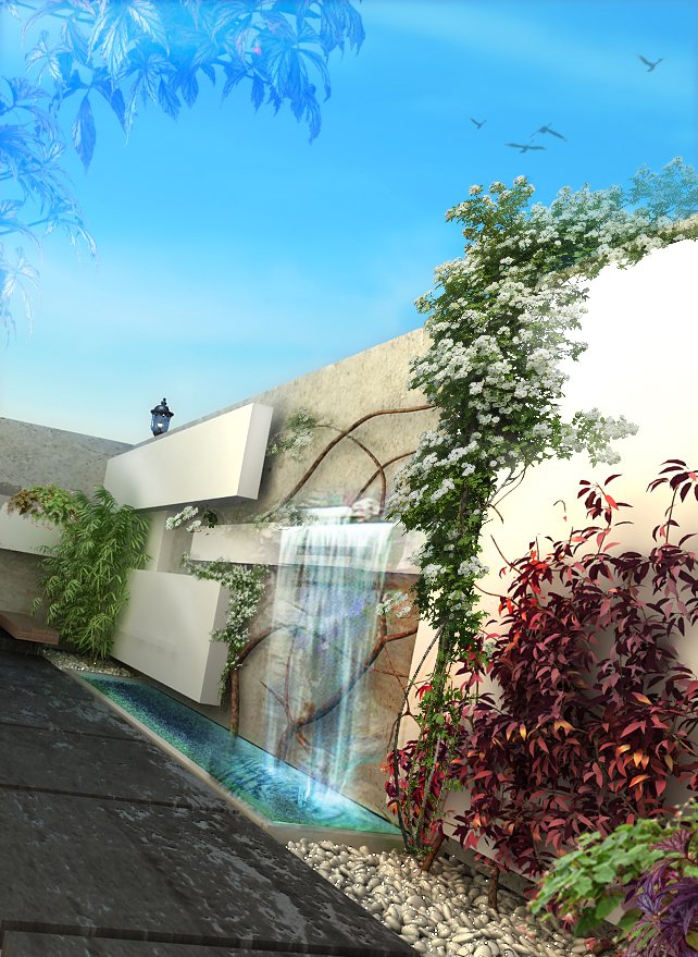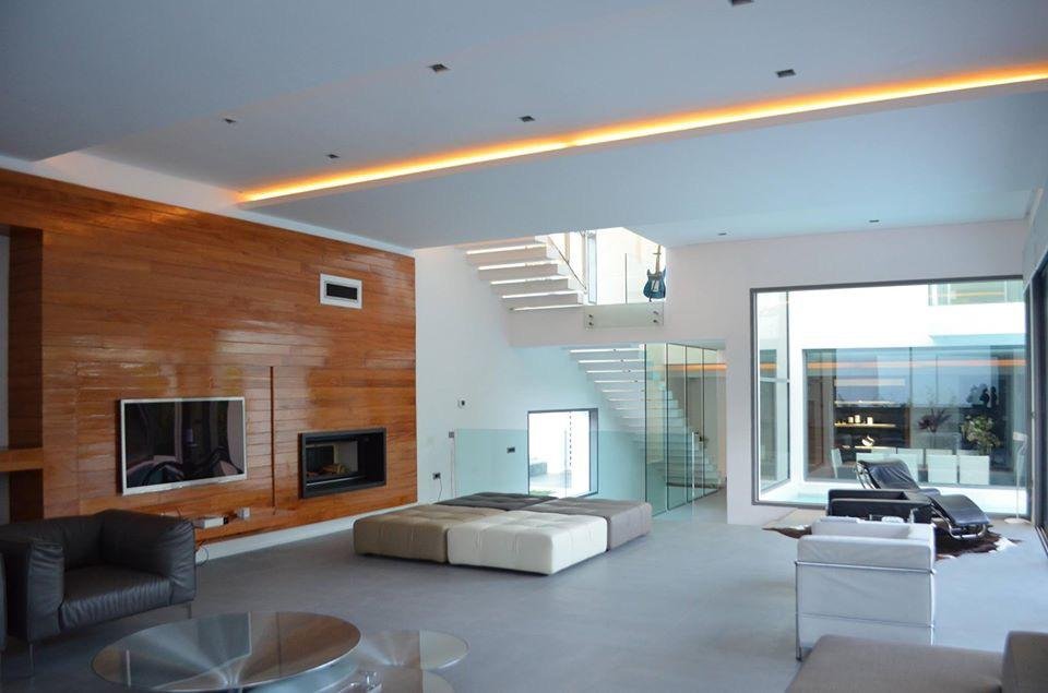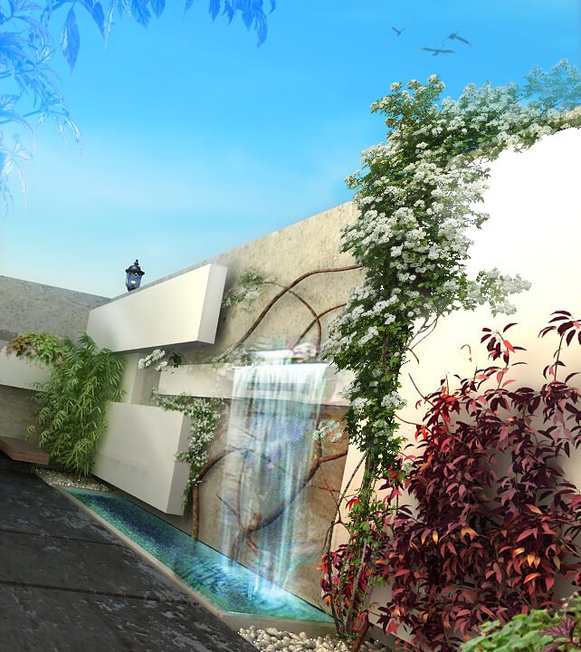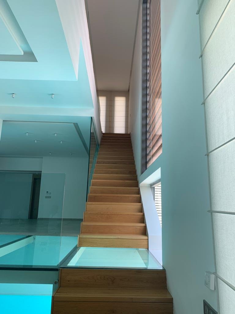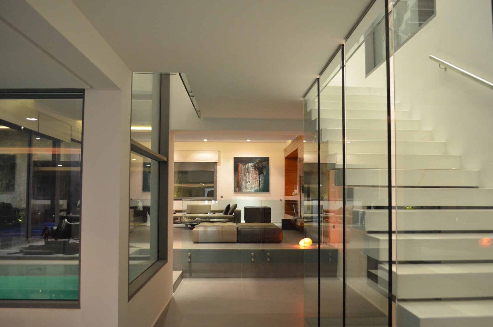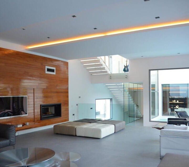 En effet, chaque chambre est représentée par une «boite», qui, superposées l’une sur l’autre, créent un jeu de niveaux entre les étages. Dans l’espace intérieur, cet emboîtement de volumes est liaisonné par des passerelles qui valsent au milieu d’un atrium de 9 m de haut. L’escalier qui conduit à ces passerelles est ajouré, et prend appuit sur la paroi nord de la villa. Il dessert Les 4 différents niveaux de l’habitation. Au niveau du rdc, tous les espaces sont articulés autour de la piscine afin que l’eau soit visuellement omniprésente. Quant au sous-sol, il est traité comme une pièce à vivre et est orienté vers un jardin vertical.